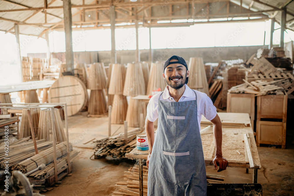 smiling Asian male entrepreneur standing wearing an apron in a woodcraft warehouse #622530828