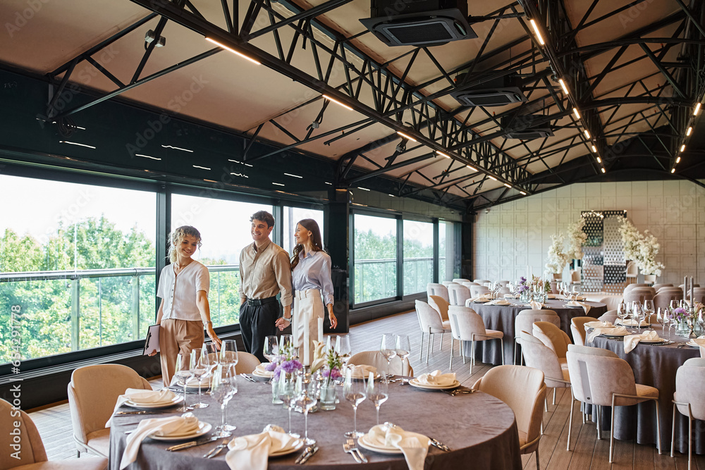 smiling banquet coordinator showing festive tables to joyful couple in decorated wedding hall #654291778