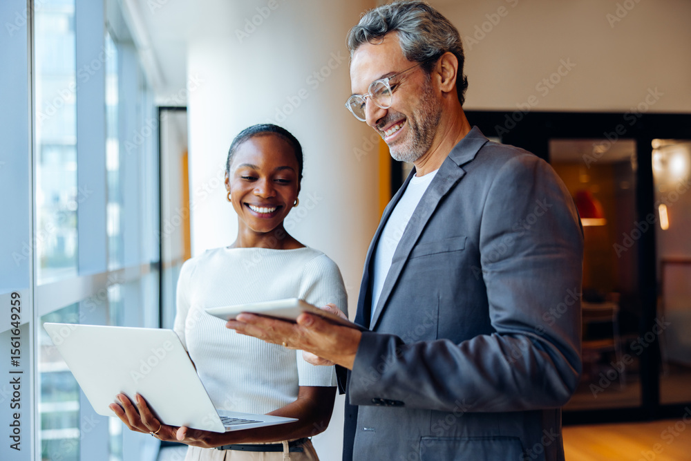 Smiling business professionals sharing ideas while working with laptops and tablets #1561649259