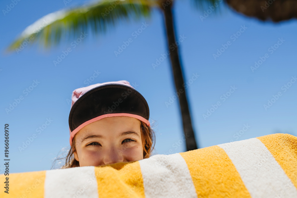 Smiling child peeking over beach towel under palm tree. #1966060970