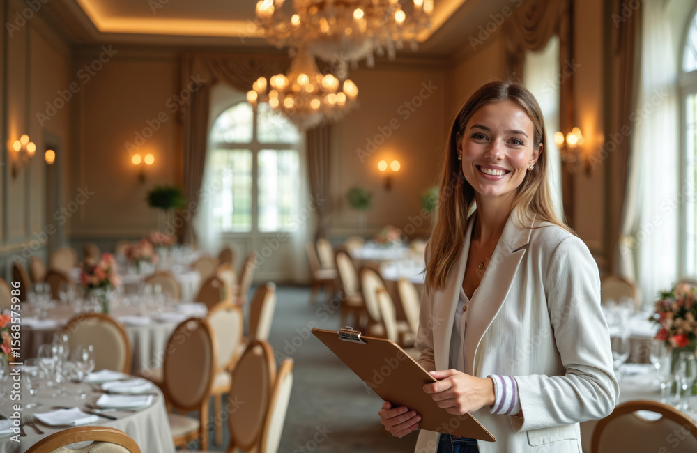 Smiling event manager with clipboard plans festivities in grand banquet hall. Professional coordinator checks festive tables, ensuring smooth celebration for special occasion. Focus on efficient #1568575986