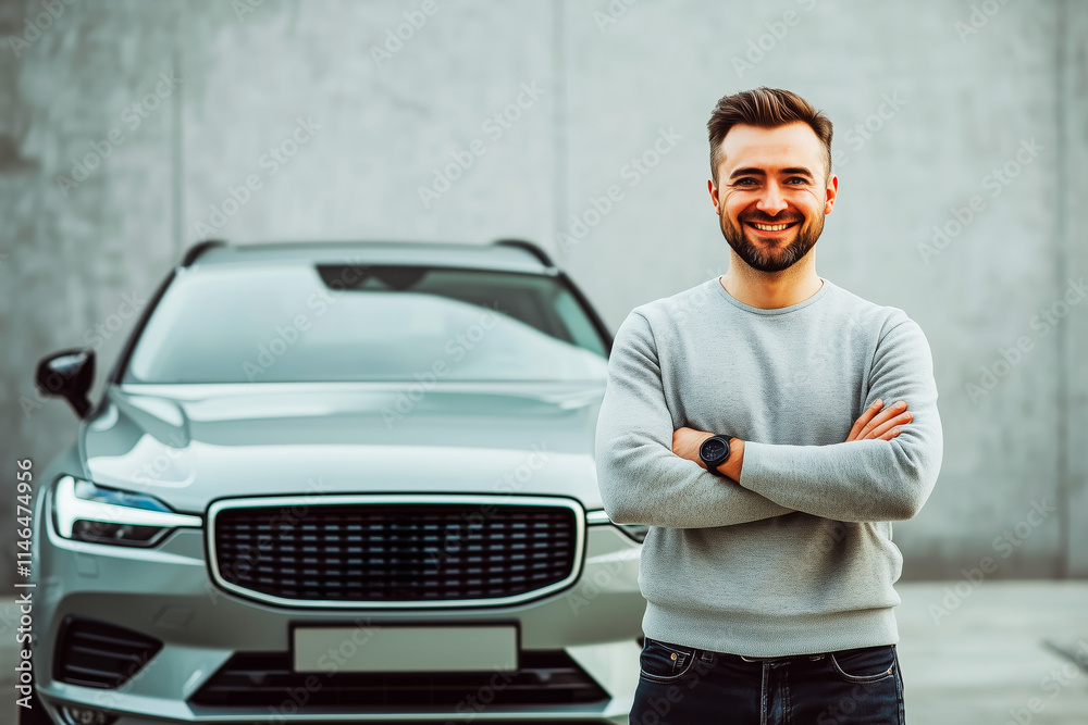 Smiling Man in Casual Outfit Standing in Front of Modern Silver SUV #1146474956