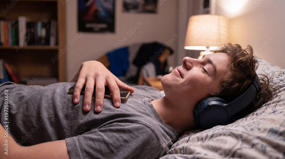 smiling teenage boy lying in bed wearing wireless headphones and listening to music as concept of digital lifestyle relaxation entertainment and peaceful evening rest at home in cozy bedroom #1977503682