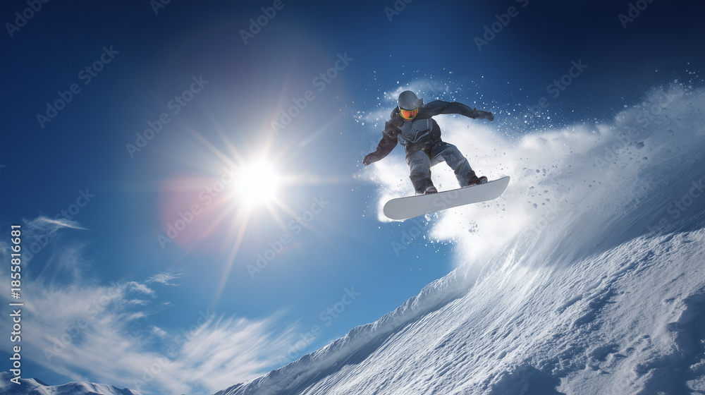 Snowboarder jumping off a powdery slope under bright sun and blue sky #1855816681