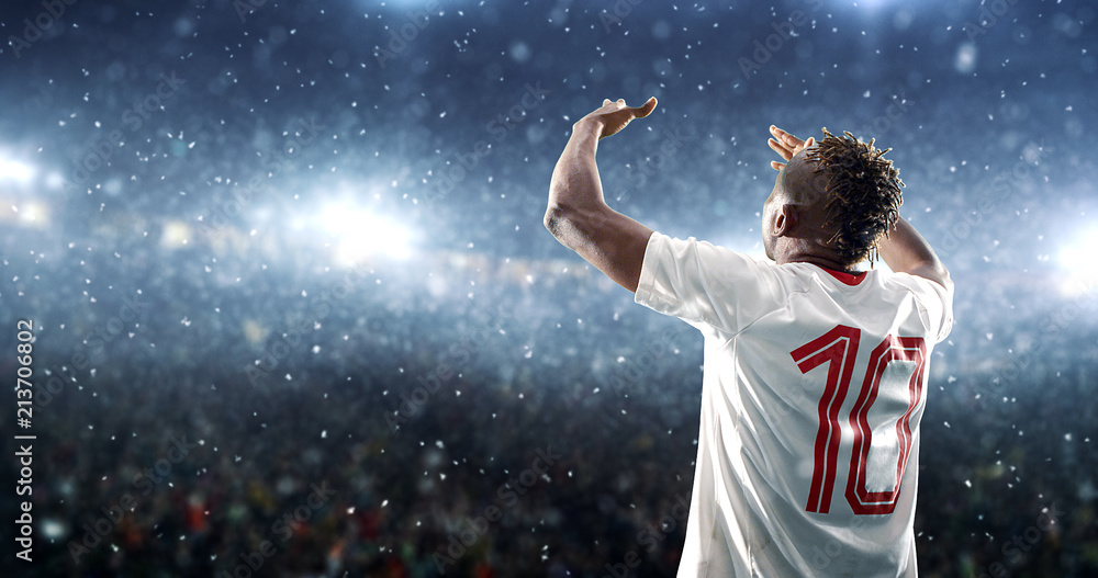 Soccer player celebrates a victory on the professional stadium while it’s snowing. #213706802