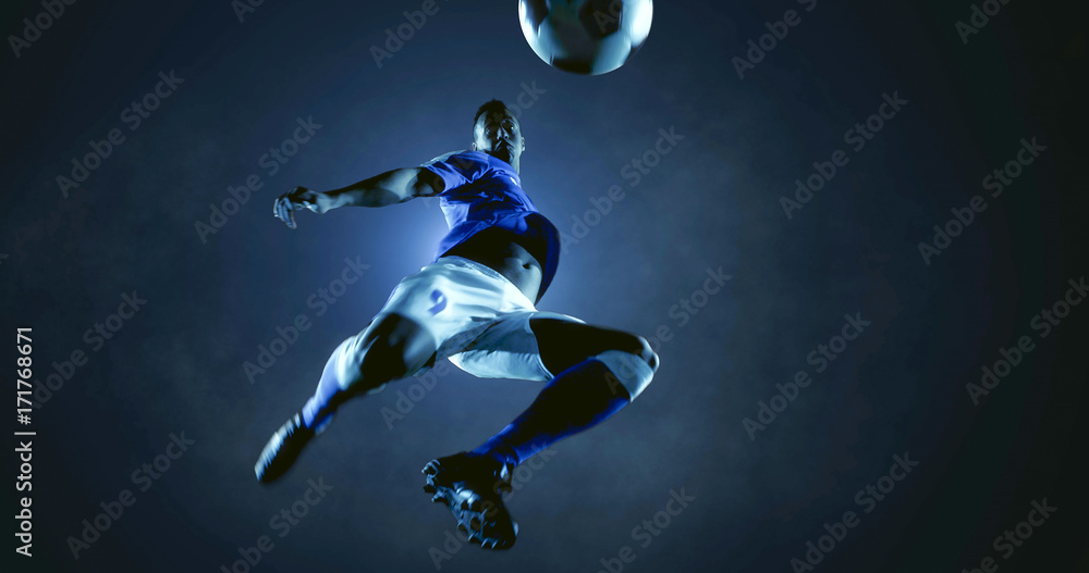 Soccer player kicks the ball on the soccer stadium. He wear unbranded sports clothes. Stadium and crowd made in 3D. #171768671
