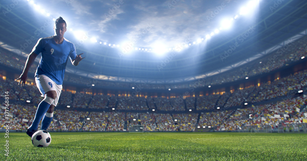 Soccer player kicks the ball on the soccer stadium. He wear unbranded sports clothes. Stadium and crowd made in 3D. #171768814