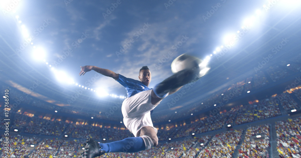 Soccer player kicks the ball on the soccer stadium. He wear unbranded sports clothes. Stadium and crowd made in 3D. #171768910
