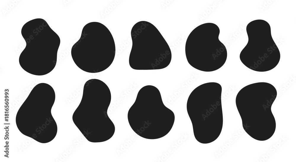 Soft fluid organic blobs and abstract irregular round forms with wavy bubble outlines, colourful doodle elements, splodge stains, minimal geometric patterns, cute retro textures, random vector frames #1816560993