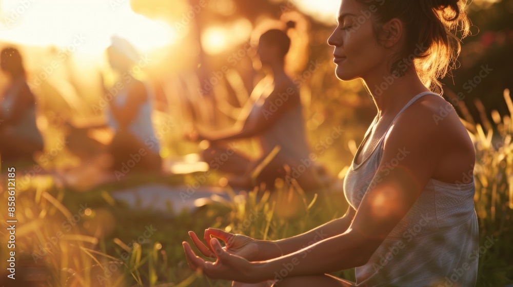 Soft focus on yogis in a beautiful outdoor location finding stillness in movement. #858612185