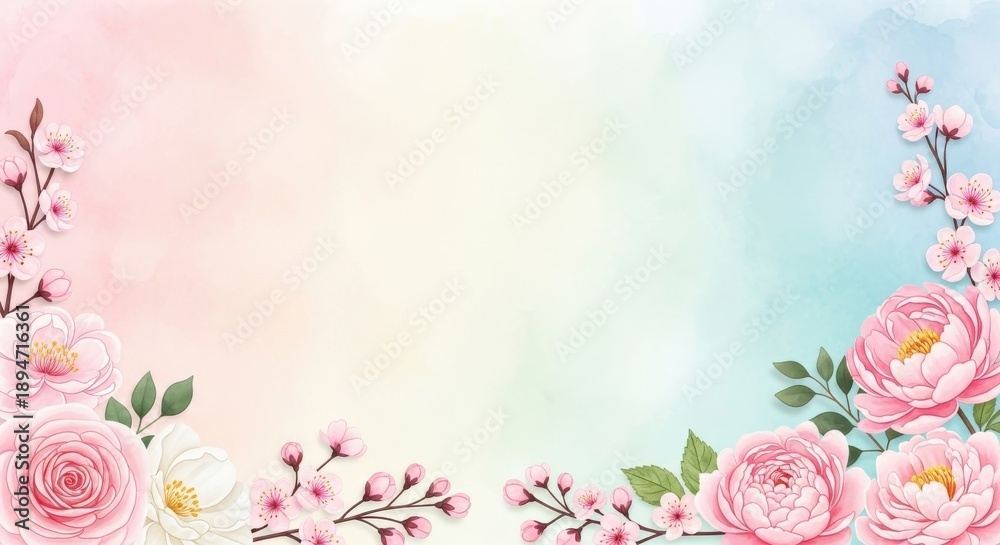 Soft watercolor illustration of delicate pink flowers framing a pastel gradient background, ideal for a gentle mother's day greeting. #1894716361