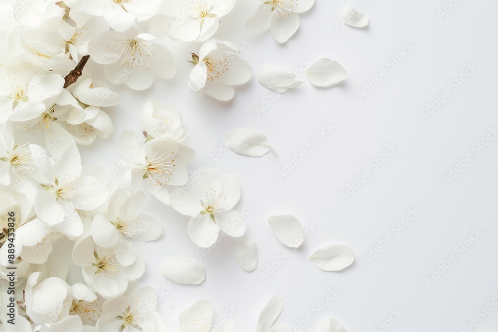Soft white flower petals spread across a white background, creating a serene and elegant composition that evokes calmness. #889433826