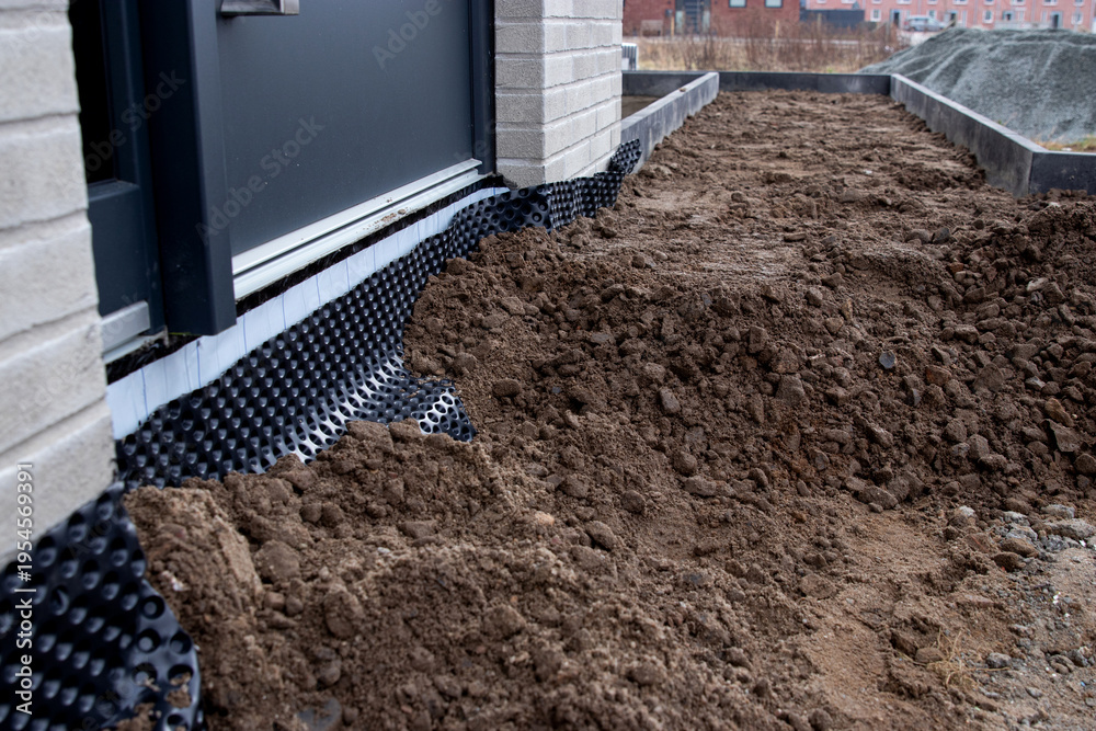Soil and gravel piled near a building foundation with drainage membrane visible along the base, construction site preparation in an urban environment #1954569391