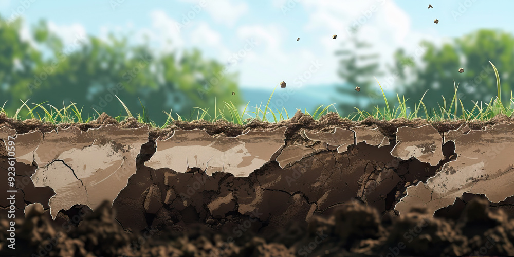 Soil erosion is the gradual erosion of life, depleting fertile soil and harming agriculture: Depict soil erosion as a crumbling landscape, symbolizing the loss of fertile soil due to unsustainable #923610597