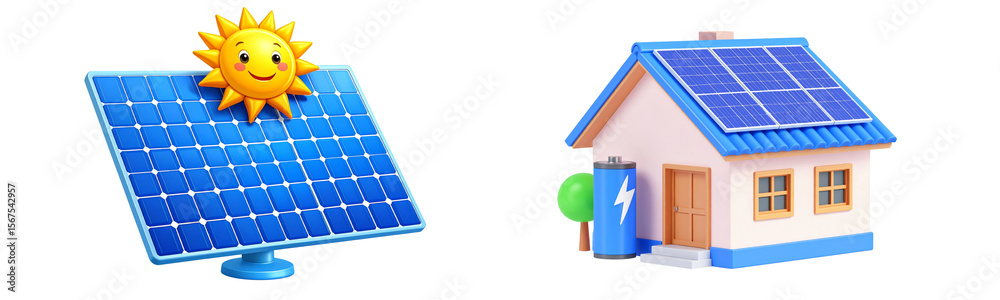 Solar panel sun house battery renewable energy eco friendly electricity sustainable power. cheerful sun shines above blue solar panel and house with solar panels symbolizing clean energy #1567542957