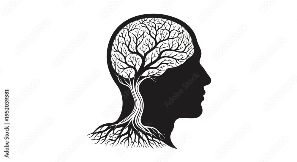 Solid Black Human Head Silhouette with Barren Tree Brain and Roots, Thought Concept, Isolated White Background. #1952039381