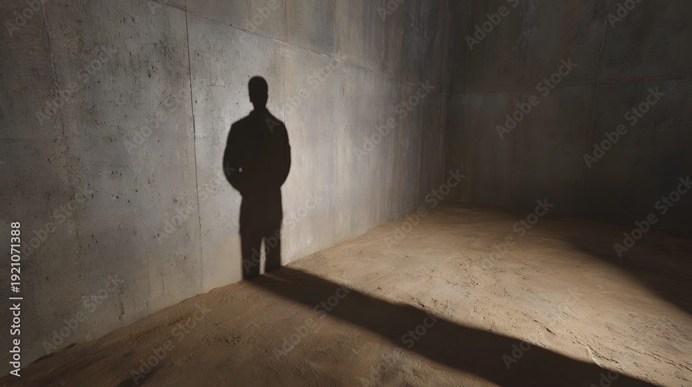 Solitary figure s shadow cast in an empty stark concrete room #1921071388