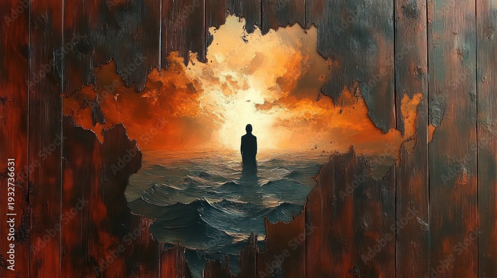 solitary silhouette standing in choppy sea beneath a fiery orange sky seen through a torn weathered wooden frame, evoking awe and melancholy #1932736631