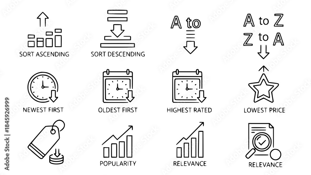 Sorting icons depict data hierarchy and chronology in a schematic arrangement on white #1845926999