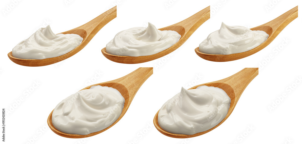 Sour Cream on wooden spoon, mayonnaise, yogurt, isolated, full depth of field #1932420824