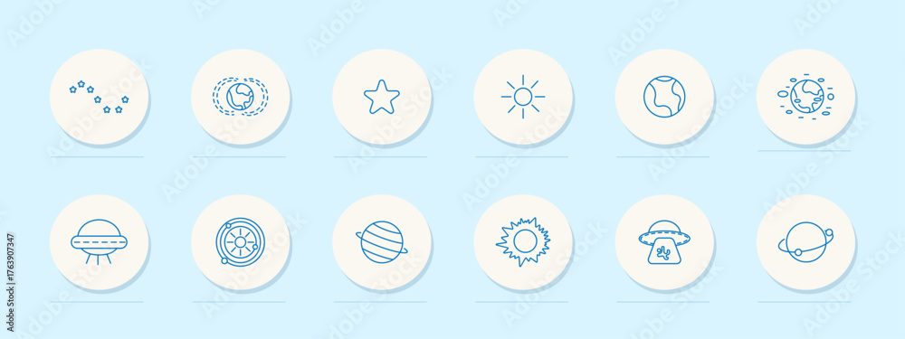 Space science set icon. Constellation, orbit, star, sun, earth, planets, UFO, satellite, ringed planet, flare, galaxy, cosmos. Astronomy, solar, fiction, universe, sky, alien, exploration, science. #1763907347