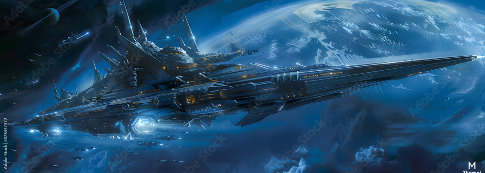 Spaceship or large space colony A massive spaceship or colony above a planetary terrain. Planet in background design #876337372