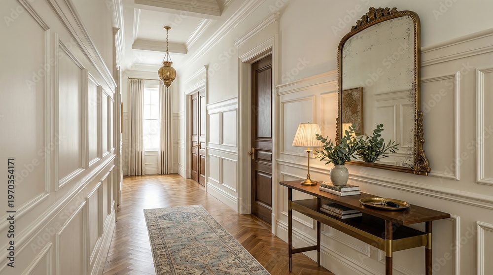 Spacious modern hallway interior with white paneled walls and polished hardwood floor. Ornate gold mirror above slim console table with brass lamp and eucalyptus vase. Elegant contemporary home #1970354171