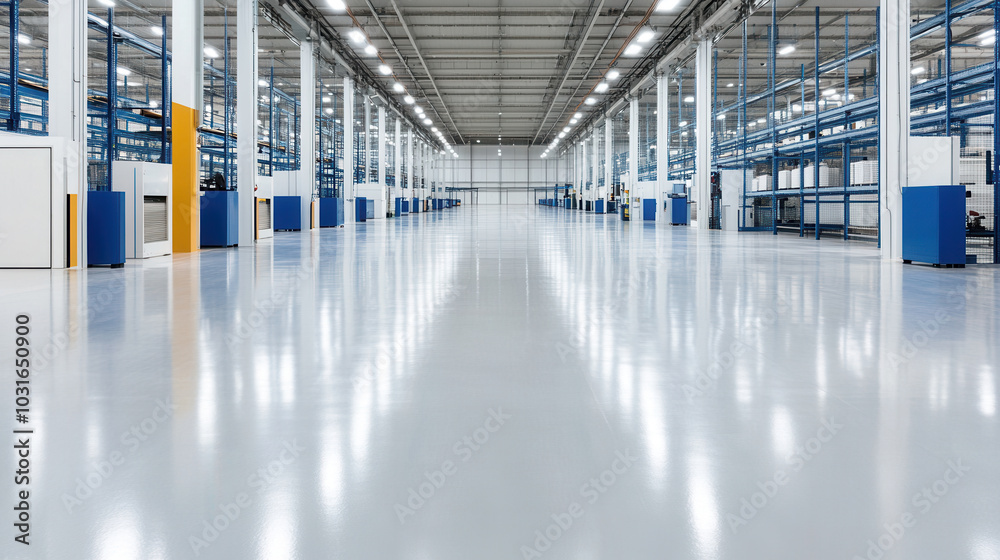 spacious warehouse featuring transparent floors and modern design, showcasing clean and organized environment ideal for industrial operations #1031650900