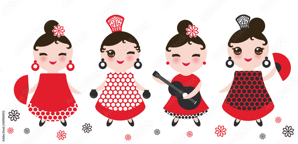 spanish Woman flamenco dancer. Kawaii cute face with pink cheeks and winking eyes. Gipsy girl, red black white dress, polka dot fabric, Isolated on white background. Vector #169896953