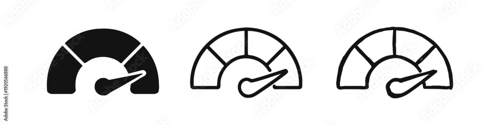 Speedometer gauge icon set. Performance indicator and data measurement symbol in solid, outline, and hand-drawn styles. #1920566888