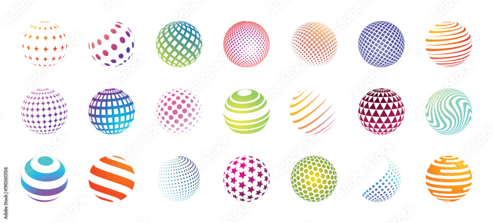Sphere logo. Globe with square or hexagon texture elements. 3D orb. Tech pixel round geometric shape. Abstract wavy graphic form. Concentric circles. Checkered surface. Vector icons set #1903613156