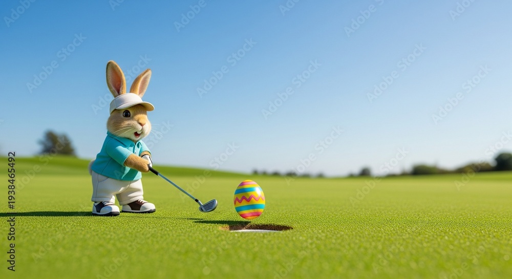 Sporty Easter bunny playing golf on sunny day. Easter Holiday concept #1938465492