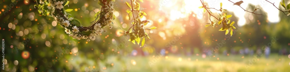 Spring floral wreath on the tree in the garden. Sunny green natural background. Summer solstice concept. Symbol of Beltane. #788202929