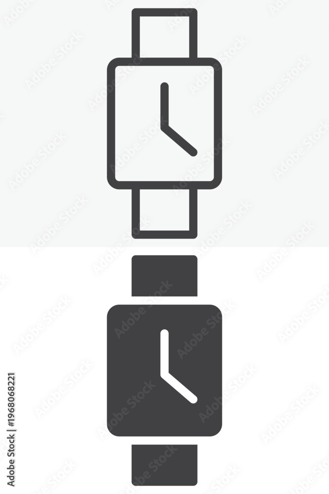 Square wristwatch icon in line, outline and solid style. Editable stroke vector sign and symbol set. Square wristwatch icon shows a wearable timepiece. #1968068221