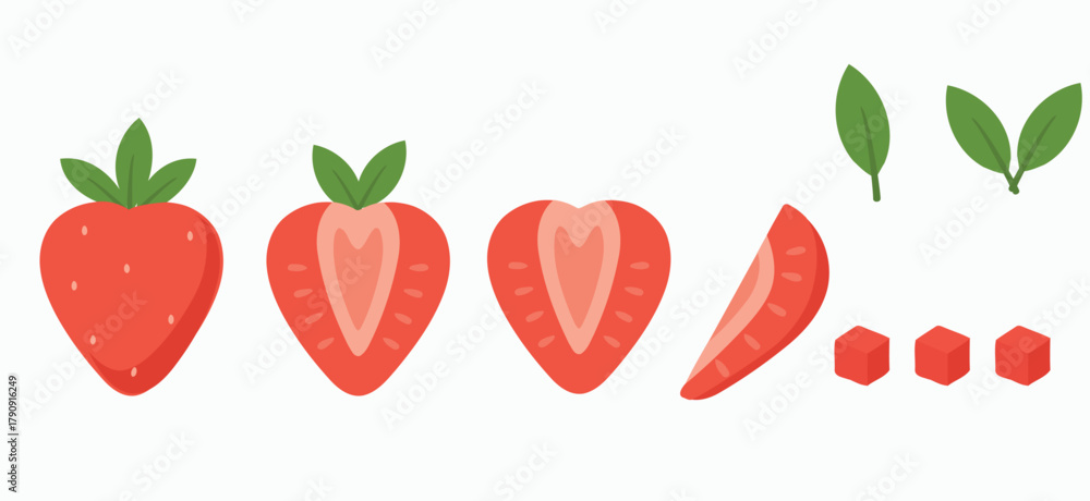 Srawberry cut set vector, whole fruit, halves, slice, cubes and leaves, flat red illustration for recipe, packaging, smoothie, dessert and kitchen design #1790916249