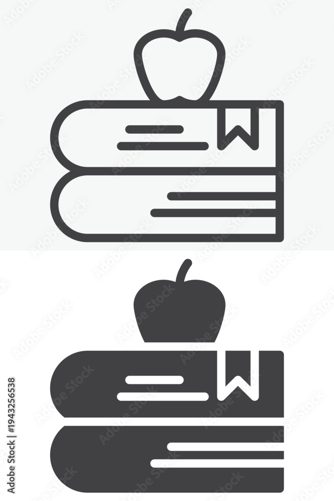 Stack of books with apple education icon. Line outline and solid icon set in different style. Editable stroke vector sign and symbol. Books with apple icon for school and study. #1943256538