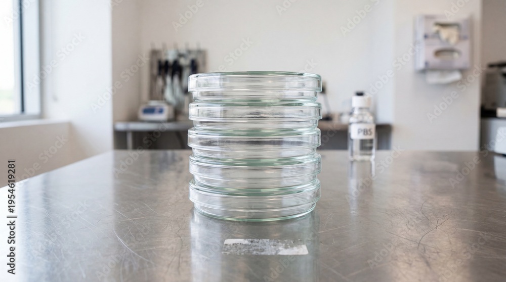 Stack of clean glass petri dishes on stainless steel laboratory bench, sterile microbiology workspace and research preparation for culture testing #1954619281