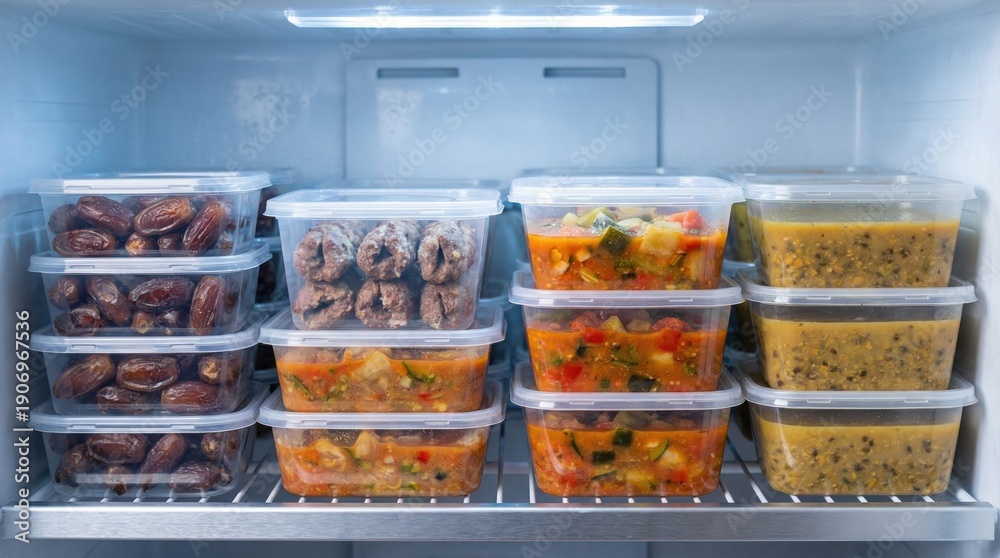 Stack of clear plastic food containers filled with dates, meatballs, stew, and soup, neatly organized on refrigerator shelves. #1906967536