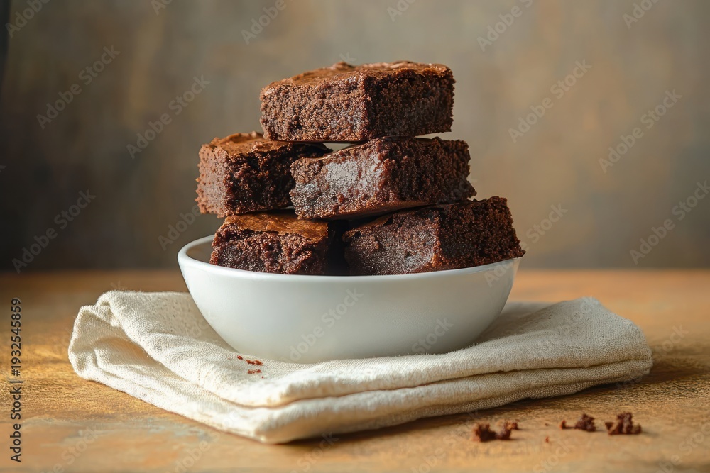 Stack of fudgy chocolate brownies in a white bowl on a linen napkin with crumbs on a wooden surface, warm rustic lighting conveying cozy homemade comfort #1932545859