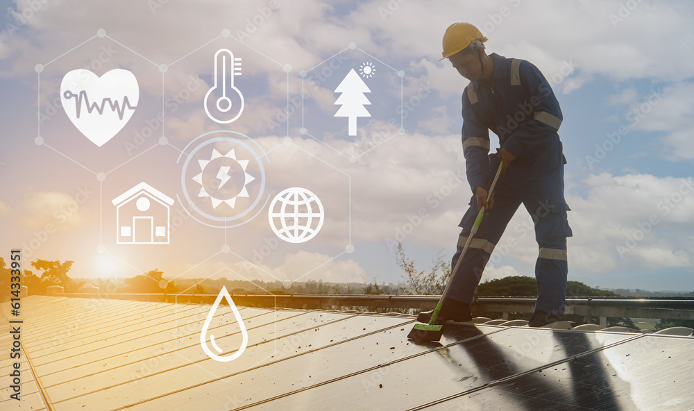 staff cleaning inspect and check solar cell panel by hold equipment box, solar energy, renewable energy,power factory concept, lowkey lighting. #614333951