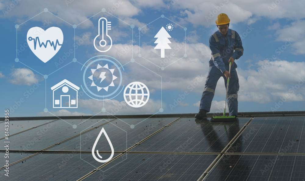 staff cleaning inspect and check solar cell panel by hold equipment box, solar energy, renewable energy,power factory concept, lowkey lighting. #614333955