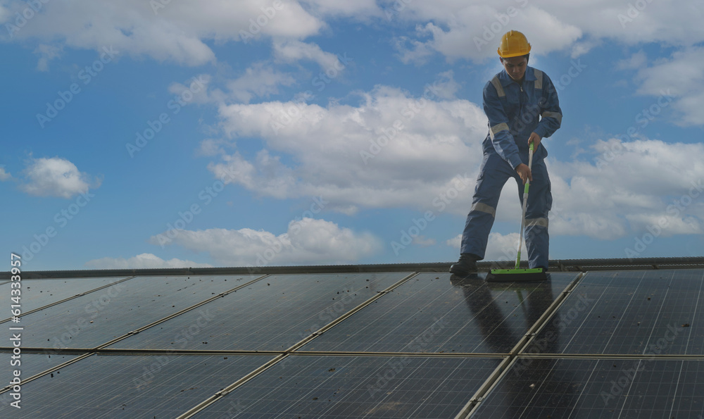staff cleaning inspect and check solar cell panel by hold equipment box, solar energy, renewable energy,power factory concept, lowkey lighting. #614333957