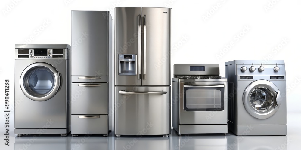 • #990411238 Stainless Steel Kitchen Appliances Lineup, Refrigerator, Oven, Washer, Dryer, kitchen appliances, modern appliances