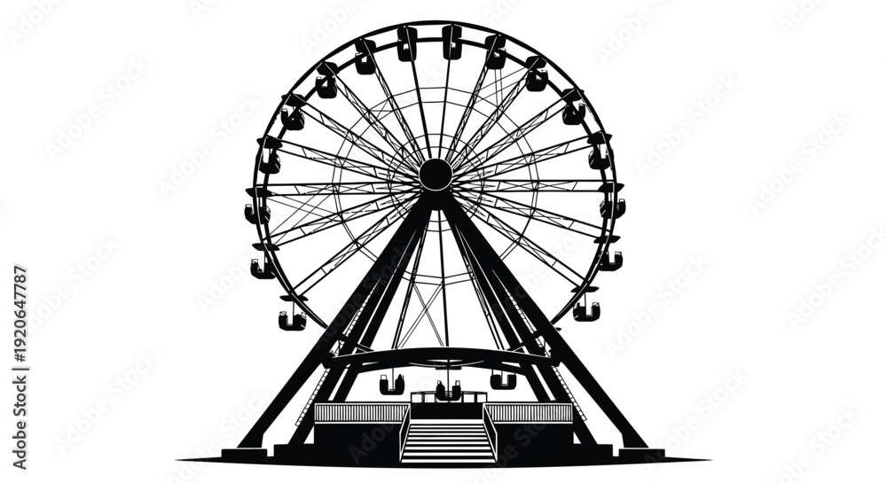Stark black and white silhouette illustration of a large observation Ferris wheel ride against a light background #1920647787