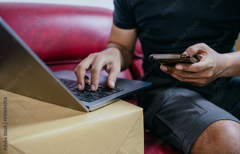 Start SME, small business entrepreneurs, SMEs of freelancers. Close-up shots of Asian man using smart phone and laptop with boxes. Online Marketing and SME Delivery Ideas. #941694754