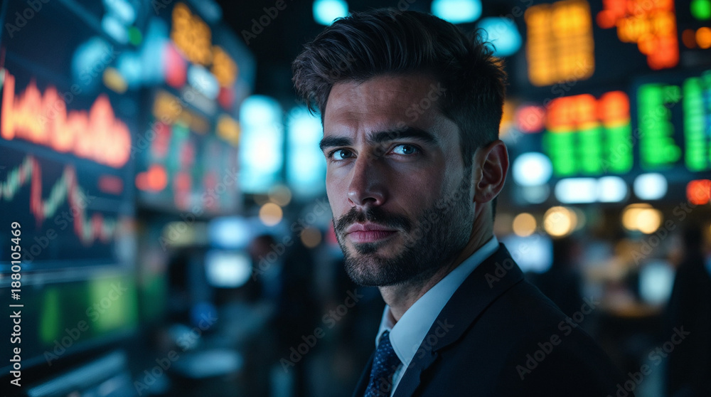 Stock broker portrait on trading floor with blurred market screens #1880105469