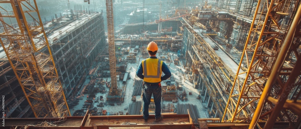 Striking editorial image of a construction worker at a massive site capturing the raw power and scale of industrial progress #961998962