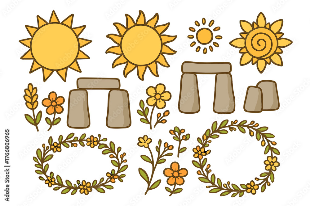 Stylized summer solstice symbols featuring sun ancient stone structures and floral wreaths #1766806965