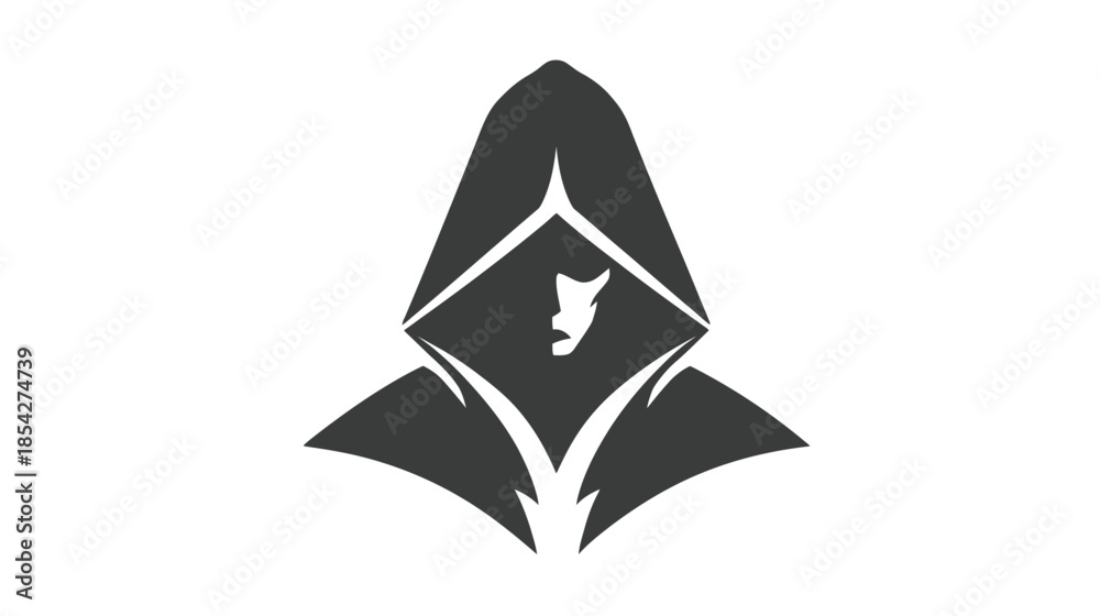 Stylized vector illustration of a mysterious hooded figure in shadow. Abstract graphic representing anonymity, stealth, and digital identity. #1854274739
