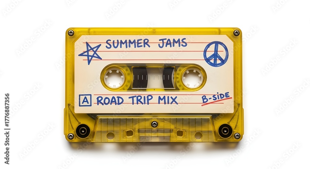 Summer Jams: A vibrant audio cassette tape, labelled with Summer Jams, invites you to relive sun-soaked days, beach vibes, and endless road trip mixes. #1776887356